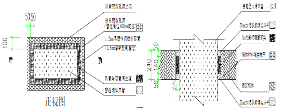 1、風管套管:風管穿越需要封閉的防火、防爆的墻體或樓板時,設 1.6mm 厚的預埋管或套管。