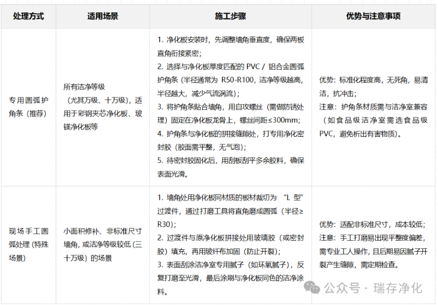 內墻角是潔凈室內部最常見的墻角類型,重點解決 “直角積塵” 問題,主流處理方式為圓弧過渡 + 密封加固,具體分為 2 種: